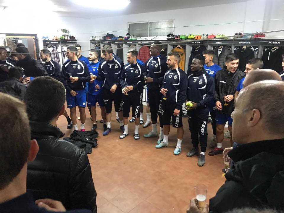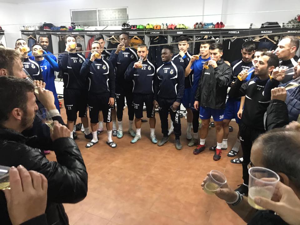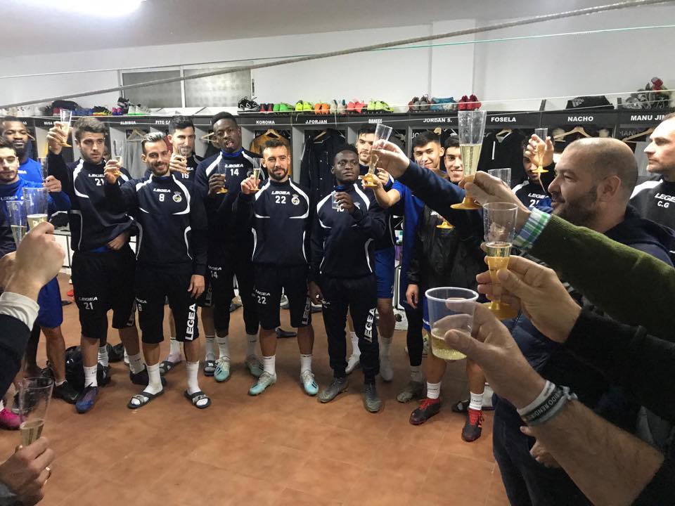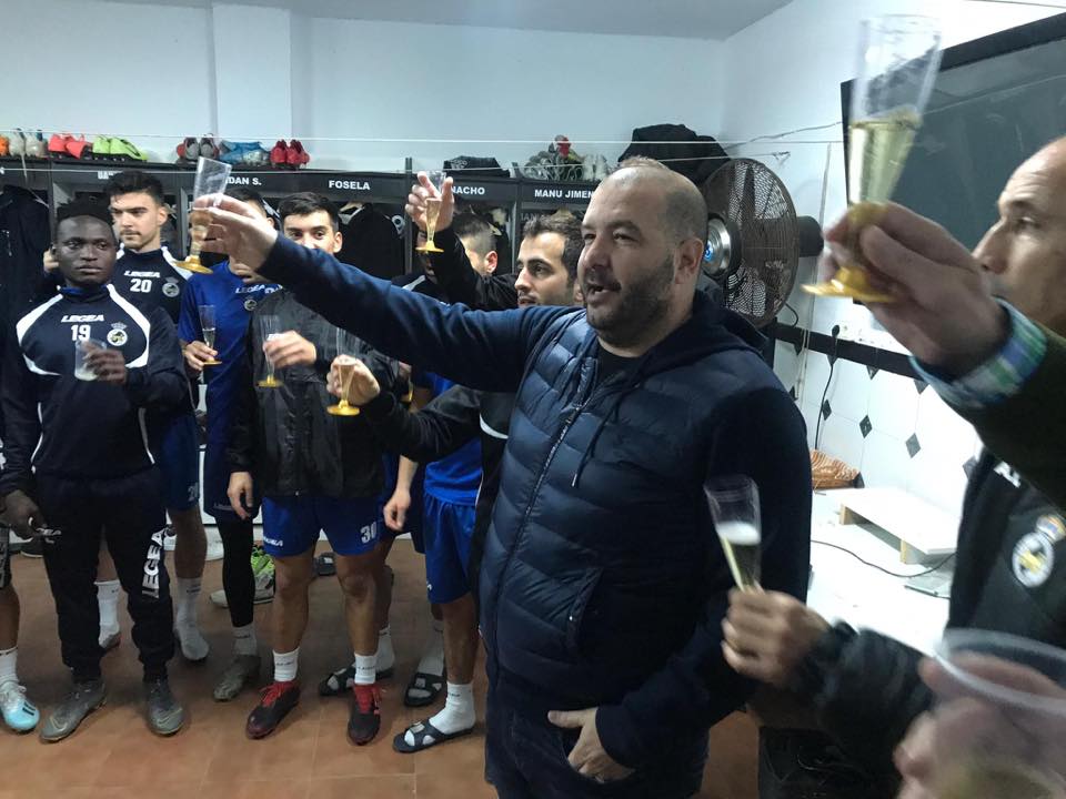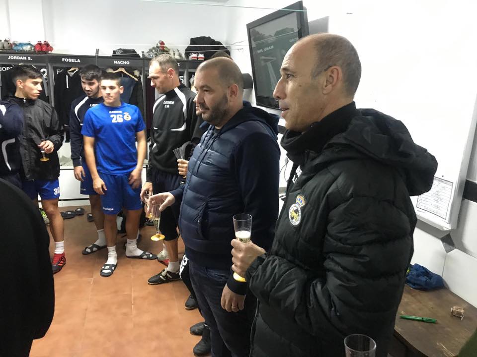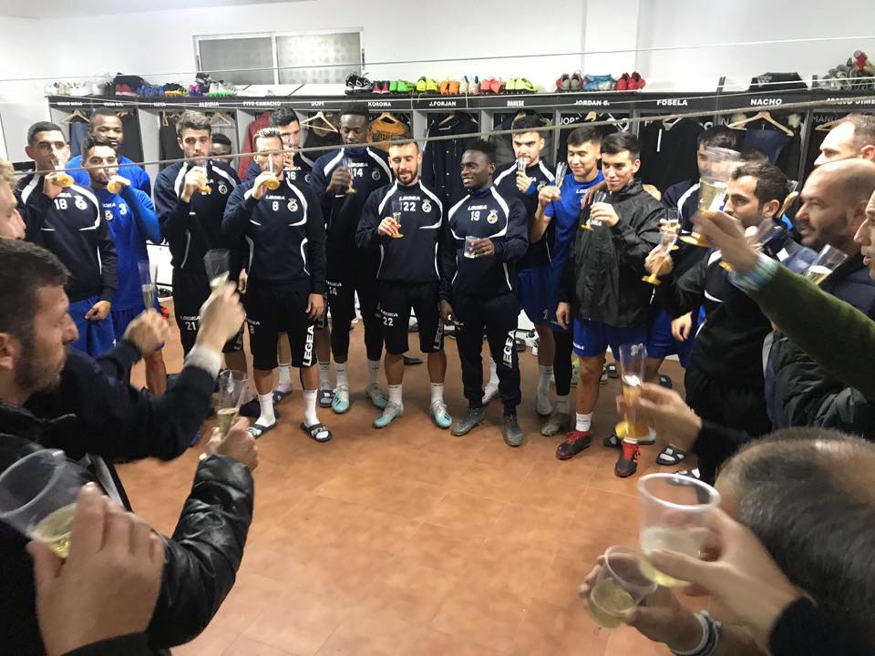 La plantilla de la Real Balompédica Linense despide el año 2019 con un brindis tras el entrenamiento.