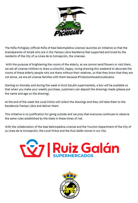 Comunicado de Centro Contigo | Desde el Centro Contigo os inivtamos a participar de la iniciativa que ha lanzado la Peña Pichigüey de la Línea para animar, arropar y desearle pronta recuperación a los abuelos de Alcalá del Valle que están en la Residencia de Tiempo Libre.