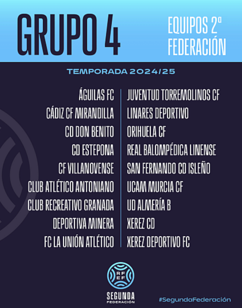 - Grupo 4: Andalucía, Murcia, CF Villanovense, CD Don Benito y Orihuela CF.