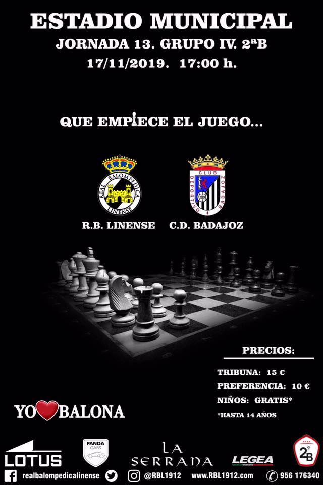 Este domingo la Real Balompédica Linense recibirá al Club Deportivo Badajoz en el Estadio Municipal de La Línea a las 17:00 horas en la décimotercera jornada del Grupo IV de la Segunda División B.